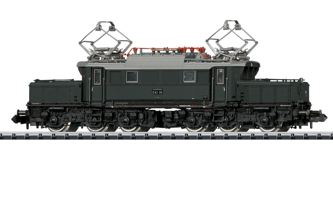 Die Maschinen der Baureihe E 93 wurden ab 1933 für den schweren Güterzugdienst in Süd-West-Deutschland gebaut. Speziell für die Bewältigung der neu elektrifizierten Steilstrecke der Geislinger Steige wurde schwere und leistungsstarke Lokomotiven benötigt Die E 93 leistete mehr als 3.000 PS Dauerleistung. Das MINITRIX-Modell zeigt den Ablieferungszustand der E 93 05 um 1937. Um die Zugkraft auch beim Modell hoch zu halten, ist das Gehäuse aus metallgefülltem Kunststoff gefertigt.