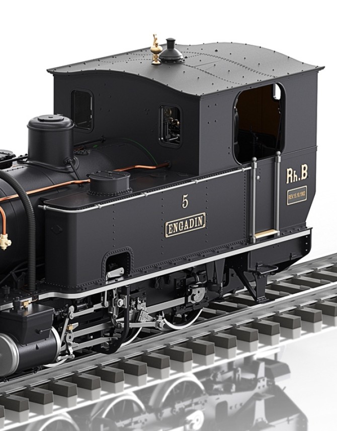 Modell der Lok 5 "Engadin" der Rhätischen Bahn. Die letzte Lok aus der ersten Lieferserie im Zustand nach der Umbenennung der Landquart-Davos-Bahn in Rhätische Bahn im Jahr 1895. Das Modell weist vorbildgerechte Unterschiede zur Rhätia auf. So sind beispielsweise Leitungen anders geführt und die Fenster an der Führerhausrückseite unterschiedlich.